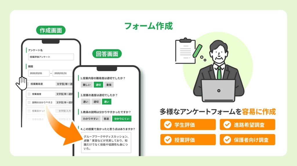 教職員がシステム上で、選択式から自由記述まで、進路希望調査アンケート、授業評価アンケート、学校評価アンケート、保護者向け調査などの多様なアンケートフォームを簡単に作成できます。